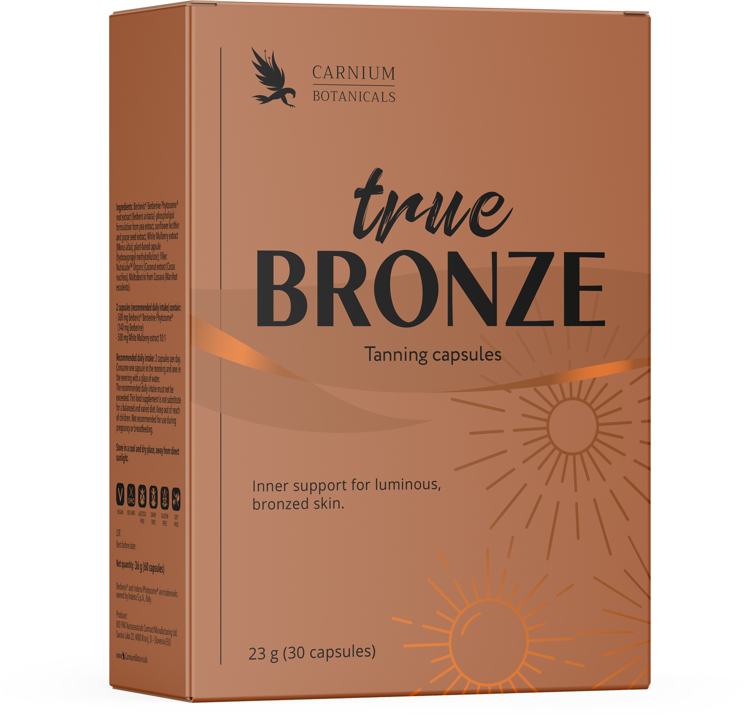A TrueBronze barnító kapszulák természetes szövetségesei a ragyogó és gyönyörű, egész évben tartós arcbőrért. A gondosan válogatott béta-karotin, likopin és asztaxantin kombináció ideális mindazok számára, akik finom barnaságot és egészséges kinézetű bőrt szeretnének felesleges napsugárzás vagy mesterséges termékek nélkül.