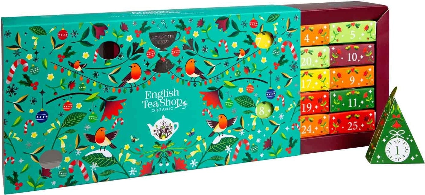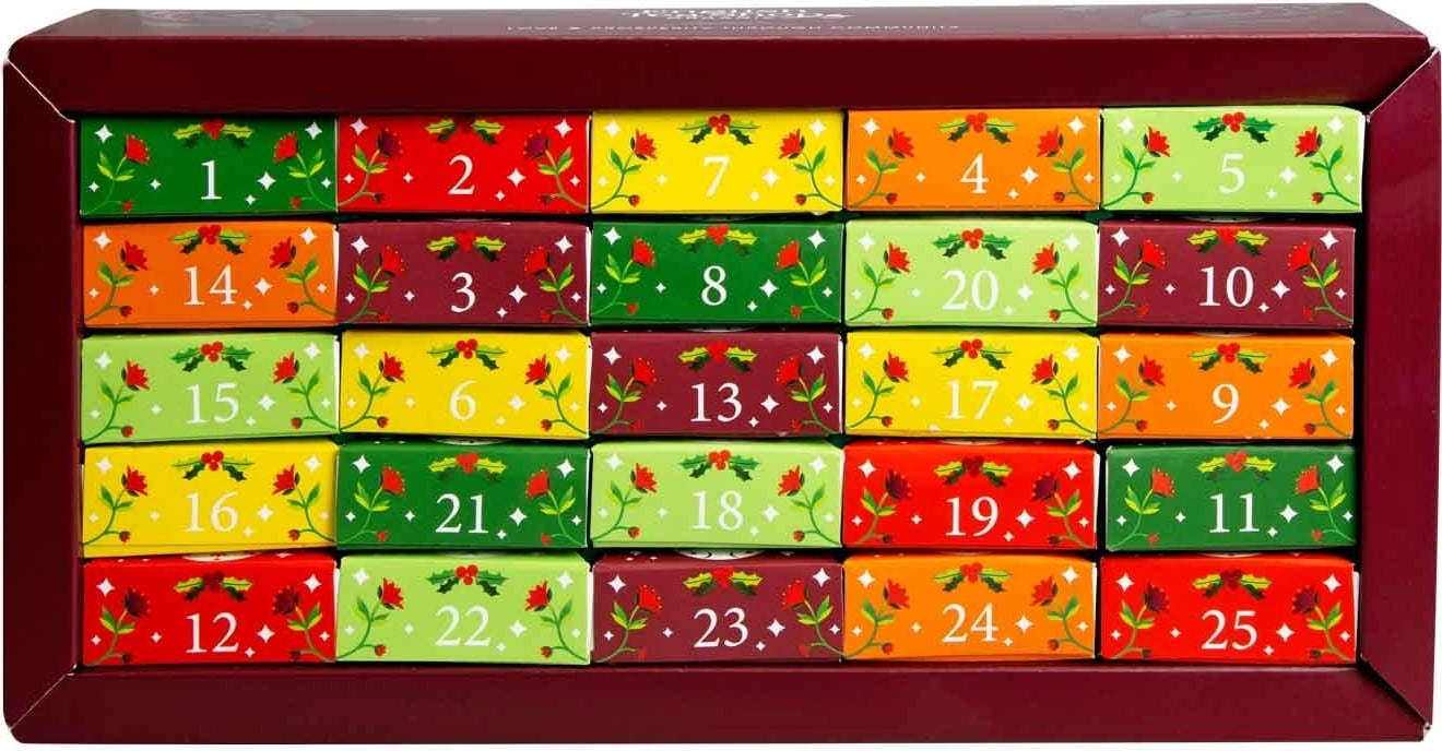 Ez a nagyméretű adventi naptár már ránézésre is elbűvölő: 25 színes kartondoboz található a szeretettel megtervezett borítás alatt. Így van, ez a naptár plusz egy teát tartalmaz! A borításra és az egyes dobozokra télies díszek vannak nyomtatva, így biztosítva a karácsonyi varázslatot a házban.