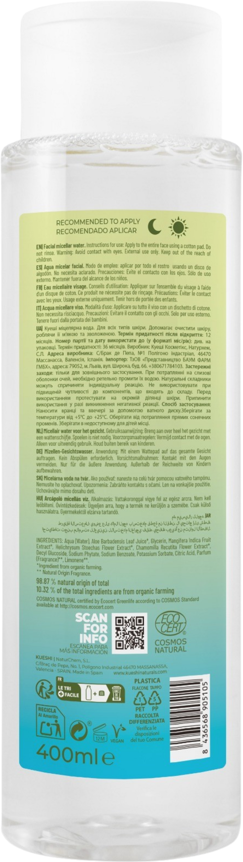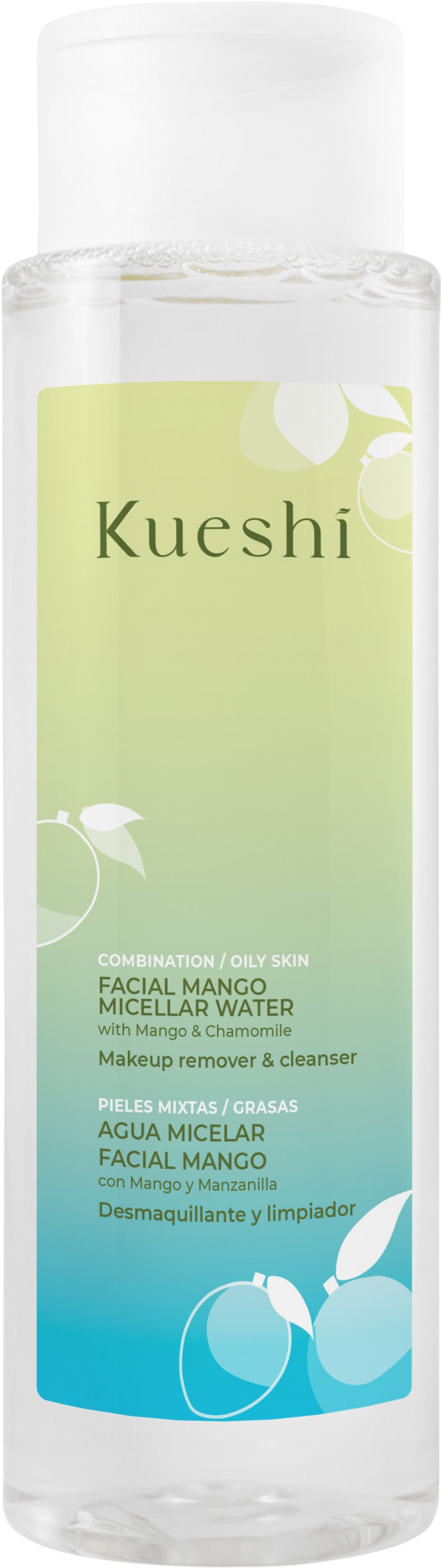 A KUESHI micellás vize gyengéden távolítja el a bőrről a szennyeződéseket és a sminkmaradványokat. A mangó- és a szalmagyopár-kivonat antioxidáns tulajdonságokkal rendelkezik, valamint támogatja a sejtek regenerálódását. Az aloe vera simaságot és elegendő nedvességet biztosít.