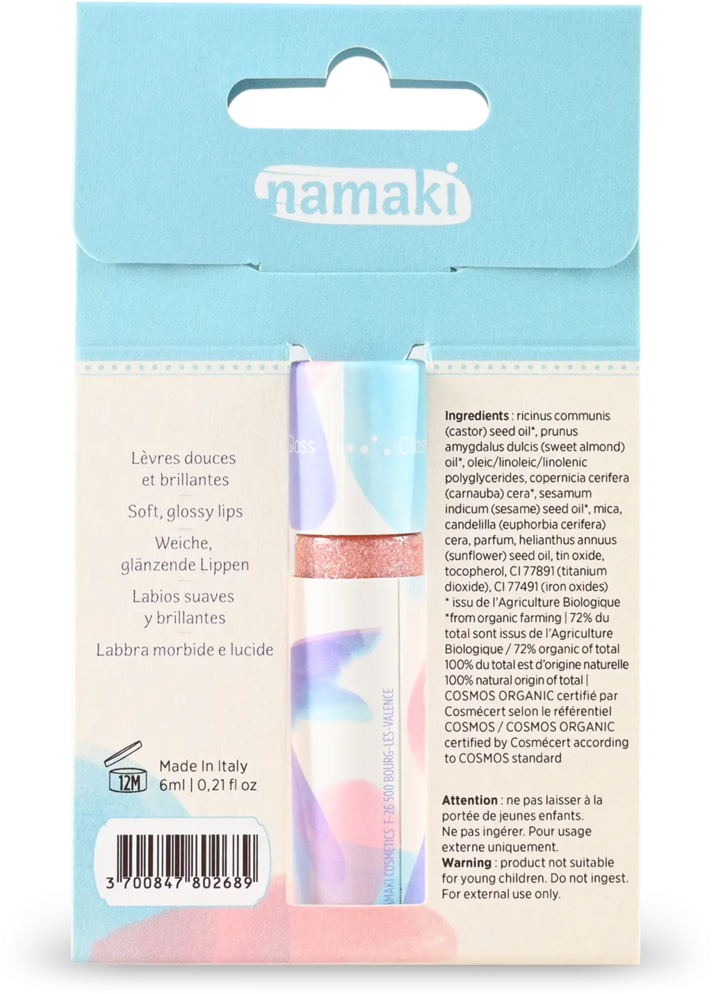 A csillogó szájfény puhává és fényessé varázsolja a kicsik ajkait. Nagy előnye a kifejezetten gyermekek számára kifejlesztett formula és a finom barackos illat.