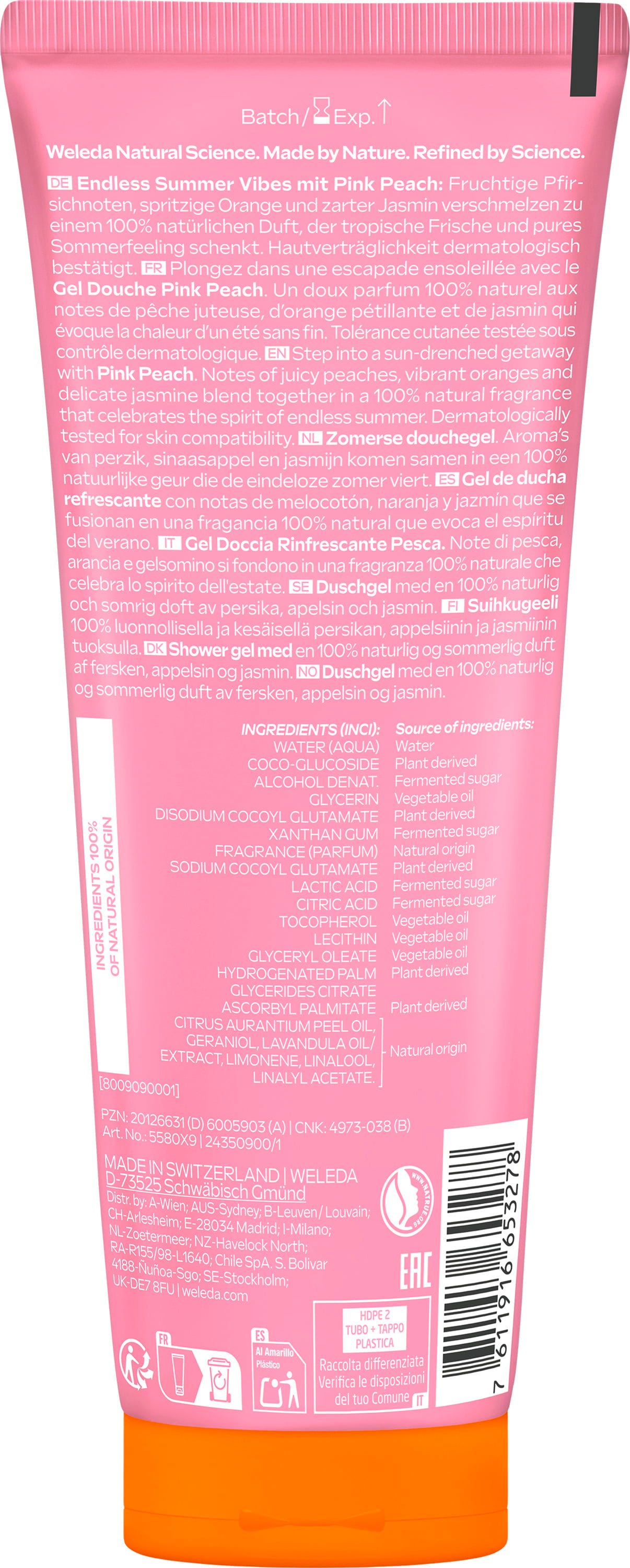 Ez a Rózsaszín őszibarack tusfürdő gyümölcsös, őszibarackos, narancsos és jázminos jegyeivel hozza el a nyarat a zuhanyzásba. Formulája különösen gyengéden tisztítja a bőrt, míg az aromák trópusi frissességet és tiszta nyári hangulatot kölcsönöznek.